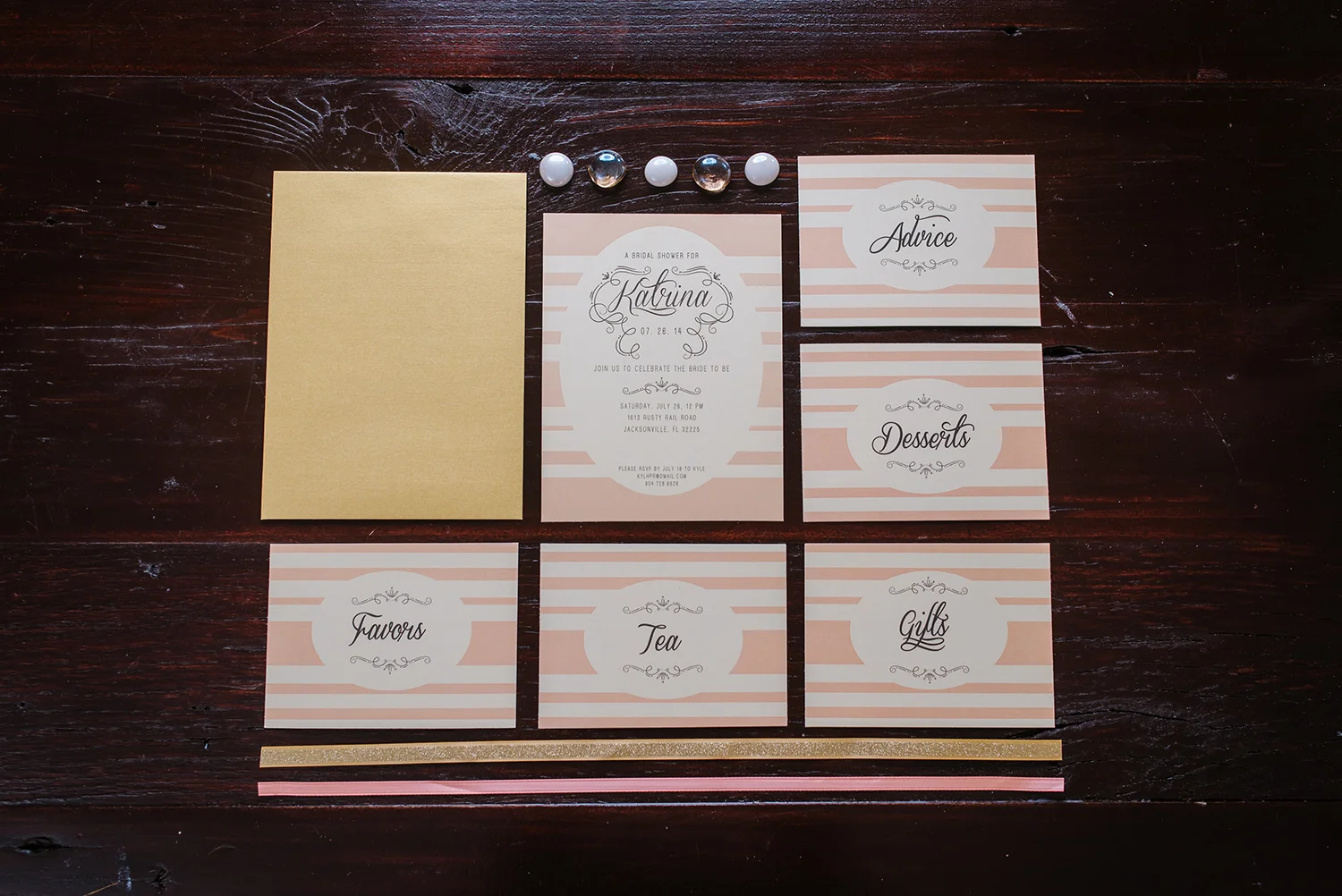 A modern girl with vintage sensibilities, Katrina wanted a soft bridal shower suite that complemented her blush and gold wedding theme. A delicate script combined with her favorite pattern (stripes) made a personal event suite for a very special bride. Vintage frames and gold/pink party accents finished off the look for this blushing bride themed shower.
